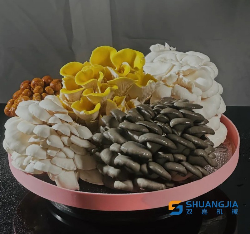 技術(shù)人員主要開展了4項工作,一是從眾多品種中集齊了黑色、灰色、白色、黃色和紅色五種顏色;二是從200多個大類品種中,根據(jù)溫型、菇型、色澤引進了16個品種,最終選擇了5個代表性品種;三是采取了分期制棒的措施,確保不同品種同時完成發(fā)菌;四是集中出菇,通過綜合環(huán)境的調(diào)控,達到同時上市的目的。