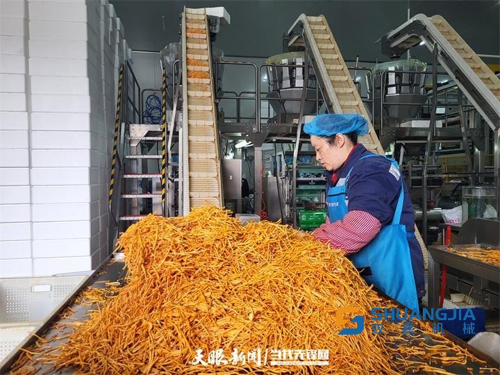 走進工廠,只見數(shù)十臺自動化設(shè)備有序運轉(zhuǎn),一袋袋包裝精美的蟲草花經(jīng)過裝盆、滅菌、接種、培養(yǎng)、出菇、包裝等工序后發(fā)往川渝、兩廣及海外市場。