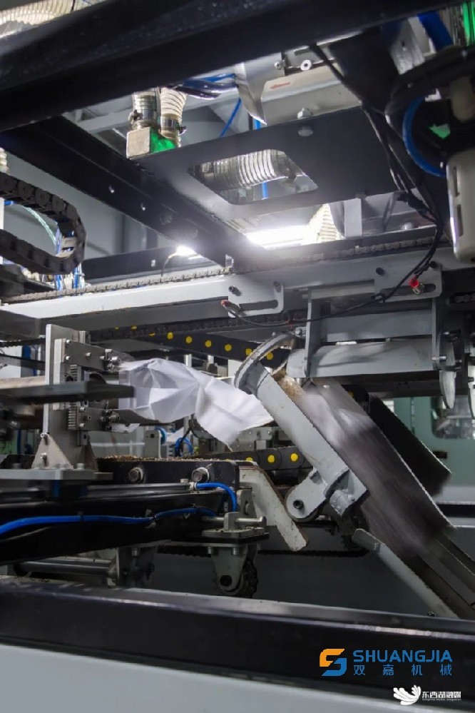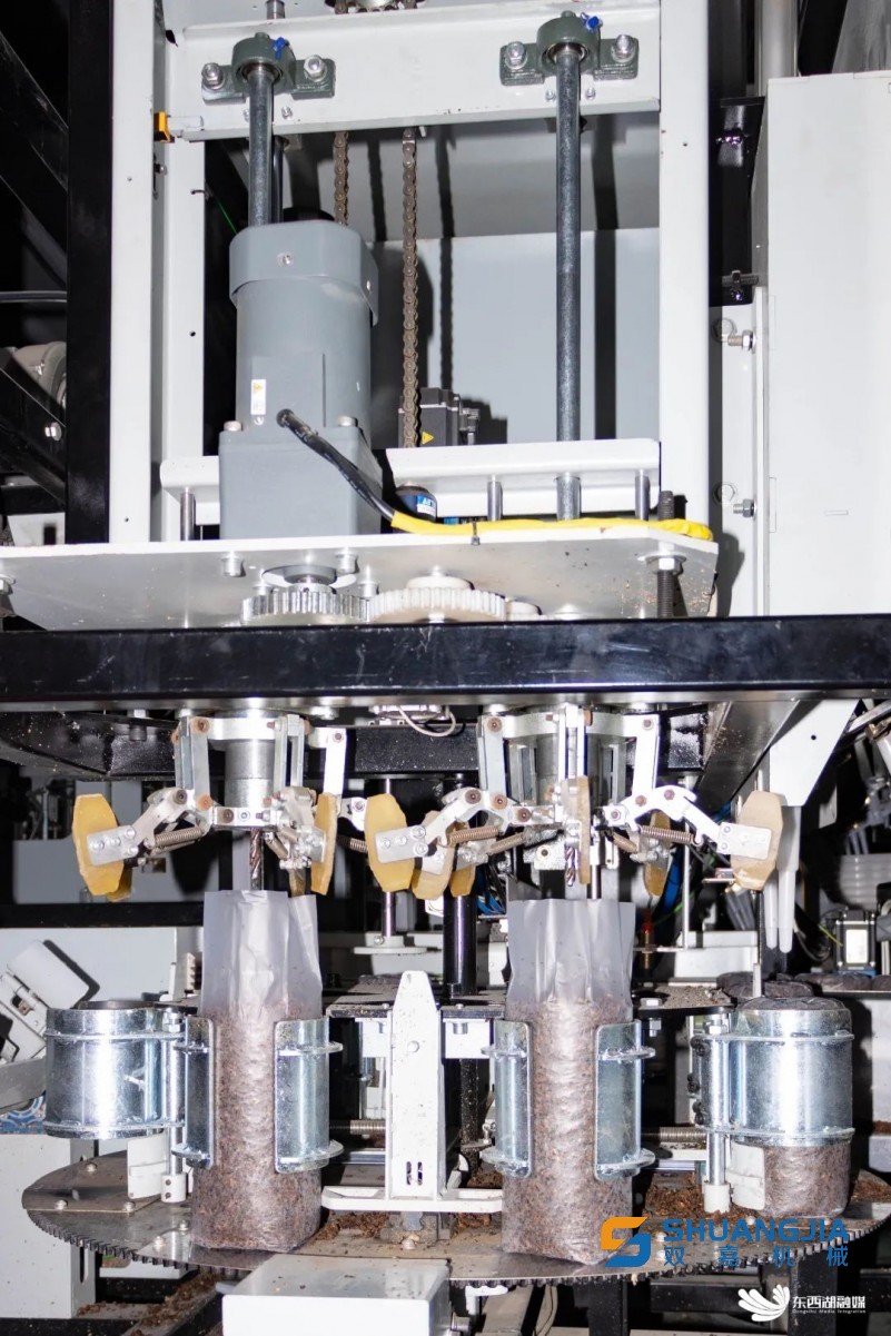 在自動裝袋區(qū),生產(chǎn)線代替人工完成套袋、填料、窩口、插棒、裝袋進(jìn)筐等一系列復(fù)雜動作。立式螺旋填料方式讓裝料更密實(shí),每包菌棒長度、重量一致。